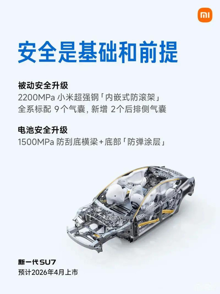 安全性方面,新一代SU7全系标配9个安全气囊,相比老款车型的7气囊新增了后排左右2个侧气囊。此外还全系标配了2200Mpa热成型钢车门防撞梁以及“内嵌式防滚架”。