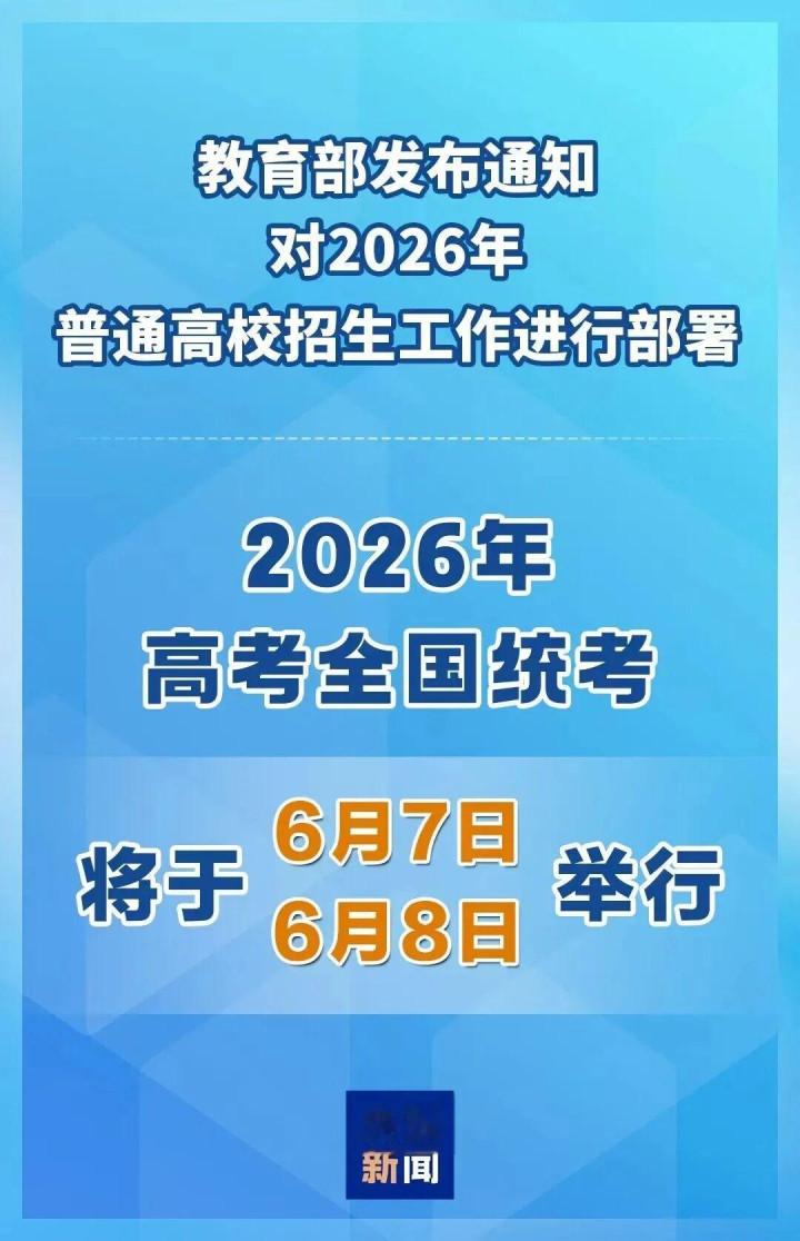 教育部22日发布通知,对2026年普通高校招生工作进行部署,2026年高考全国统考将于6月7日、8日举行。(央视新闻)