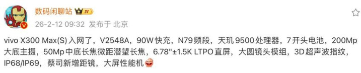 vivo X300系列再添新成员,型号V2548A的新机悄然中计,搭载7000mAh硅碳负极电板、天玑9500芯片等旗舰成就,预测3月细致发布。这是否意味着大屏万能旗舰将成为安卓阵营的新赛说念?