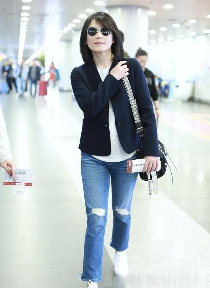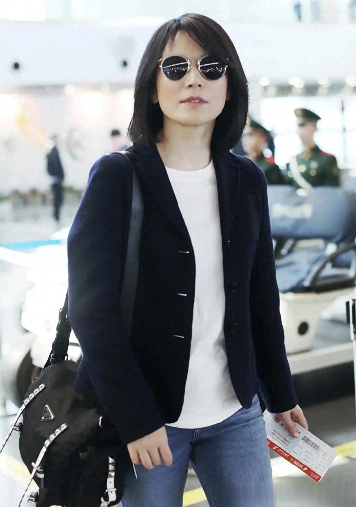 milan 54岁俞飞鸿波波头真好看! 穿黑色西装+白T+牛仔裤, 时髦又高级!