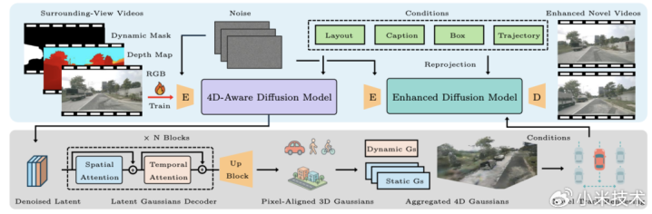 我们的方法通过两个关键步骤有效地生成具有3D一致性的多轨迹视频:(1)提出一个融合多模态信息的4D-aware扩散模型,以前向方式生成像素对齐的4DGaussians;(2)利用增强的videodiffusionmodel对由这些Gaussians渲染得到的新视角视频进行细化。在多个基准数据集上的大量实验表明,WorldSplat能够高质量地生成具有时、空间一致性的多轨迹新视角驾驶视频。