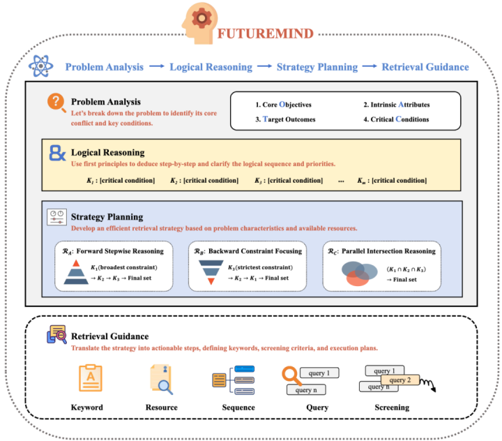 FutureMind通过自适应知识蒸馏,从大型语言模型(LLMs)中提炼出高级认知能力,包括问题分析、条件排序、策略规划及检索决策等思维先验,构建了由问题分析、逻辑推理、策略规划与检索指导模块组成的动态推理流水线。该流水线辅以三种不同的检索范式(前向、反向及并行检索策略),有效拆解复杂查询,显著减少无效调用和冗余检索,极大提升了推理效率与检索准确率。