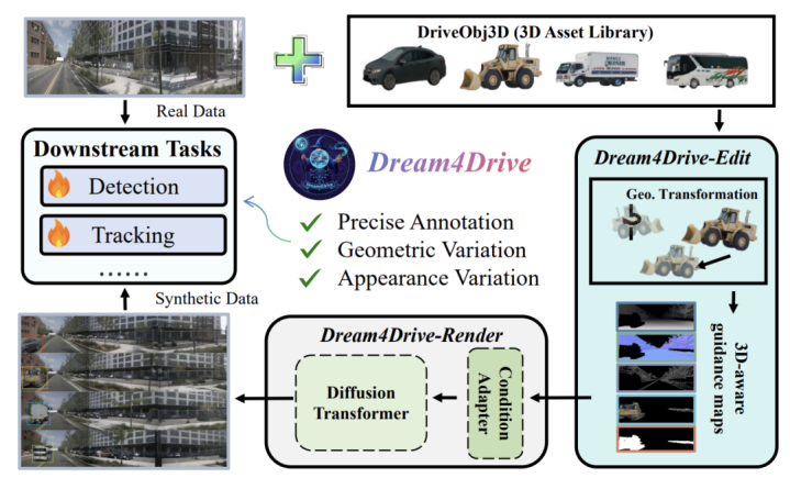 本文提出Dream4Drive框架,重新审视自动驾驶世界模型在下游感知任务中的应用价值,打破“合成数据越多越好”的固有认知与传统方法依赖“刷epoch”的训练困境。通过3D感知引导图分解、3D资产编辑与世界模型渲染的核心流程,实现对目标位姿、轨迹和外观的精准控制,生成多视角一致、照片级真实感的驾驶视频,同时配套构建大规模3D资产数据集DriveObj3D。