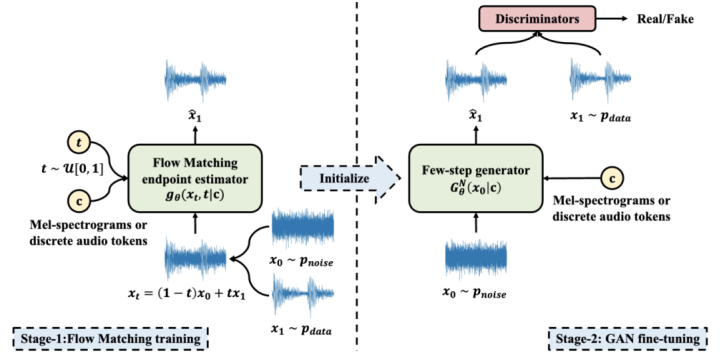 现有主流的音频生成方法主要包括生成对抗网络(GAN)以及基于扩散的生成方法(如FlowMatching)。其中,GAN在训练过程中往往存在收敛缓慢的问题,而扩散类方法在推理阶段通常需要多步采样,带来较大的计算开销。