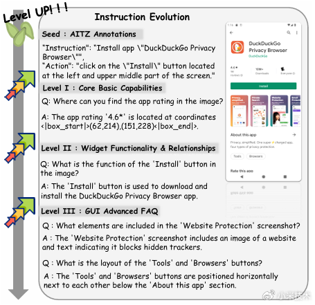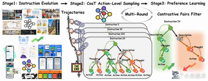 为此,我们提出MobileIPL(IterativePreferenceLearning)框架,以更高效、可扩展的方式实现过程监督:(1)Thinking-levelDPO(T-DPO):通过迭代采样构建CoaT-tree,对叶子节点进行rule-basedreward评分,并结合反向归因将稀疏的“结果信号”精确回传至中间思考步骤,从而自动构造高质量偏好对,持续优化模型的思考过程与探索策略;(2)InstructionEvolution:引入三阶段指令演化机制(生成+过滤),有效扩展任务分布,显著缓解warm-upSFT过拟合,系统性提升Agent的UI理解能力与数据多样性。