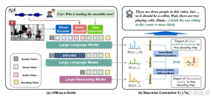 为了应对上述挑战,本文提出Training-free的ThinkOmni框架,旨在将成熟的文本推理能力“零成本迁移”至全模态场景,为具备感知能力的模型外接一个“最强大脑”进行实时指导,不再依赖昂贵的模型微调和数据收集,通过策略引导实现能力的跃升。