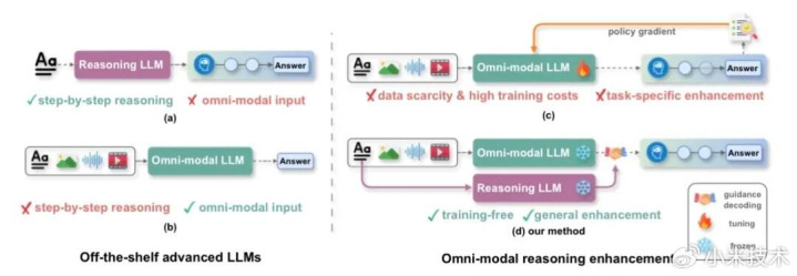全模态推理,是智能系统从理论解题到现实应用的关键一步,但在现有技术路径中常面临两大瓶颈:一是现有的全模态大模型虽擅长感知多样化模态,却缺乏类似推理大模型的复杂逻辑推理能力,出现“感知强、推理弱”的偏科现象;二是通过额外训练来提升推理能力门槛极高,面临高质量数据稀缺、特定任务适配困难以及高昂计算成本的挑战。