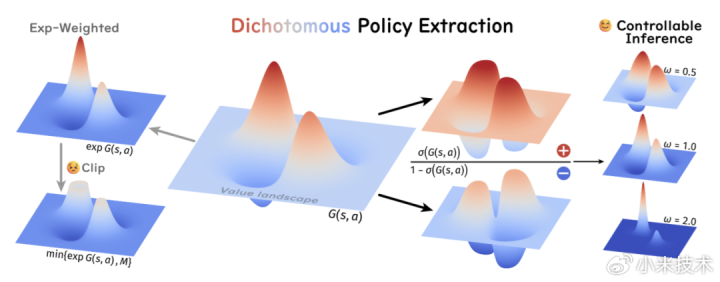 本文提出一种稳定且可控的扩散策略优化算法DIPOLE(DichotomousDiffusionPolicyImprovement)。通过重新审视KL正则化强化学习目标,我们提出贪婪化策略正则化,将最优策略分解为奖励最大化与最小化的二分策略。推理时通过线性组合两者的概率分数生成动作,从而灵活控制策略贪婪性。
