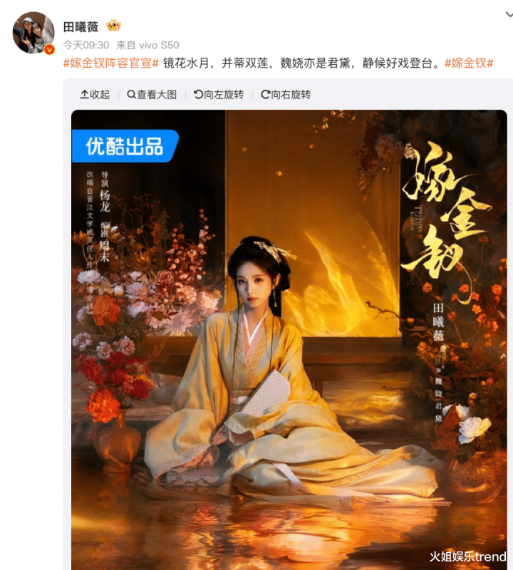《嫁金钗》里田曦薇的剧照瘦了很多,圆脸现在已经是鹅蛋脸了。说句挨骂的话,这官宣照有点像古装写真,显得田曦薇小家碧玉,这么大制作的剧,这个水准是有些低了。