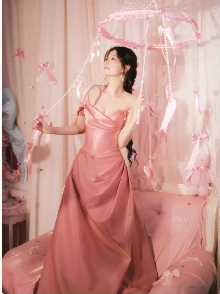 这组写真的惊艳,在于造型的极致巧思与王楚然的完美演绎。一袭浅粉色抹胸长裙贴合身形,勾勒出她流畅的肩颈线条与纤细腰肢,7年古典舞沉淀的挺拔仪态,让她即便身着甜系礼裙,也自带舒展的优雅气场。裙身的柔纱材质泛着淡淡柔光,行走间裙摆轻扬,如樱花飘落般浪漫,冷白皮在粉色映衬下更显通透,光影勾勒的轮廓宛若春日樱花般治愈。发间点缀的168个手工粉色蝴蝶结,层层叠叠如粉色云朵倾泻,既无堆砌的沉闷,又添满格的童话感,与手持的蝴蝶结透明雨伞形成视觉闭环,细节处的用心让整个造型浑然天成。