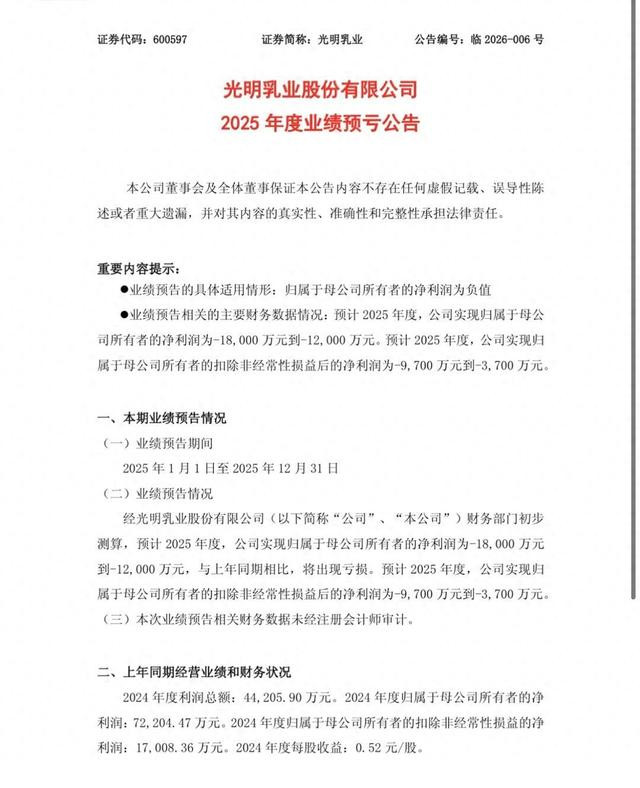 1月21日光明乳业发布公告,预计2025年度实现归属于母公司所有者的净利润将出现亏损,亏损额预计超过1亿元人民币。其核心原因直指位于新西兰的海外子公司——SynlaitMilkLimited(新莱特乳业)。公告称,新莱特生产基地出现生产问题,导致存货报废及成本费用激增,造成重大直接损失,进而拖累母公司业绩。光明乳业持有新莱特65.25%的股份,这笔15年前被寄予厚望的战略投资,如今却成了业绩报表上的“出血点”。
