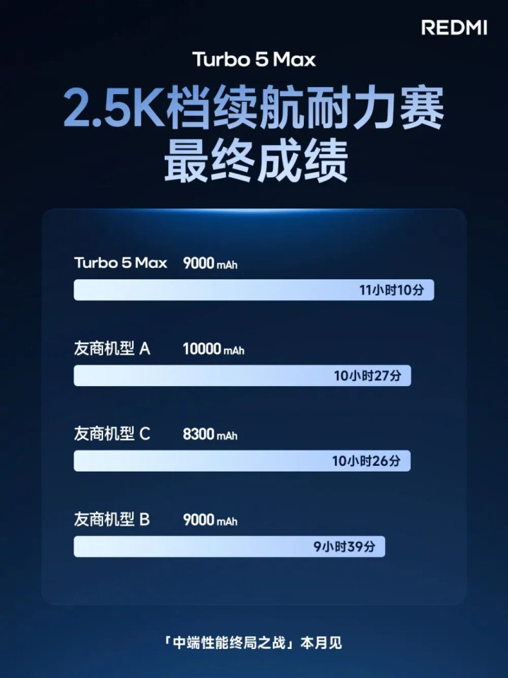 官方结果显示,REDMI Turbo 5 Max 领先第二名 10000mAh 友商 43 分钟,重度使用 11 小时 10 分钟。