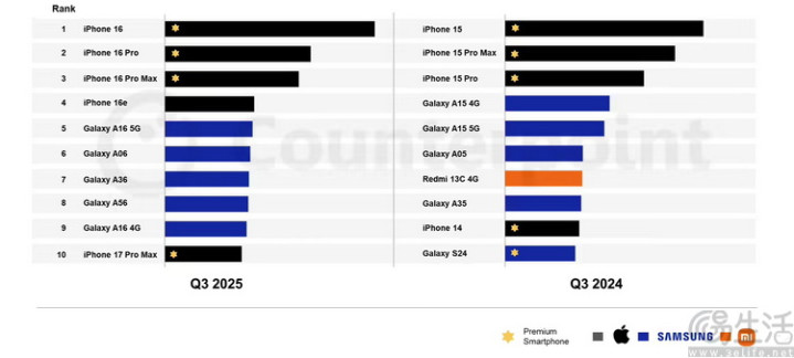比如,市场调研机构CounterPoint Research在2025年12月公布的数据显示,2025年第三季度全球最畅销的10款智能手机中,有五款是来自苹果的高端或旗舰机型,剩下的五款则全都是三星的Galaxy A系列产品。而且这并不是什么短期现象,哪怕是拉长时间跨度,在三星Galaxy A系列中最便宜的A1x、A0x等入门型号,也总是能占据“全球最畅销入门机”榜首的位置。