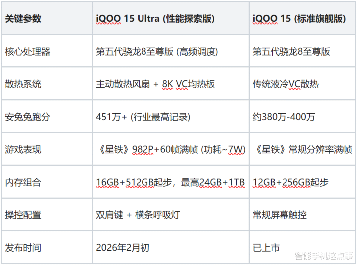 为了直观展示其性能跨度,我整理了iQOO 15 Ultra与标准版及竞品的关键参数对比: