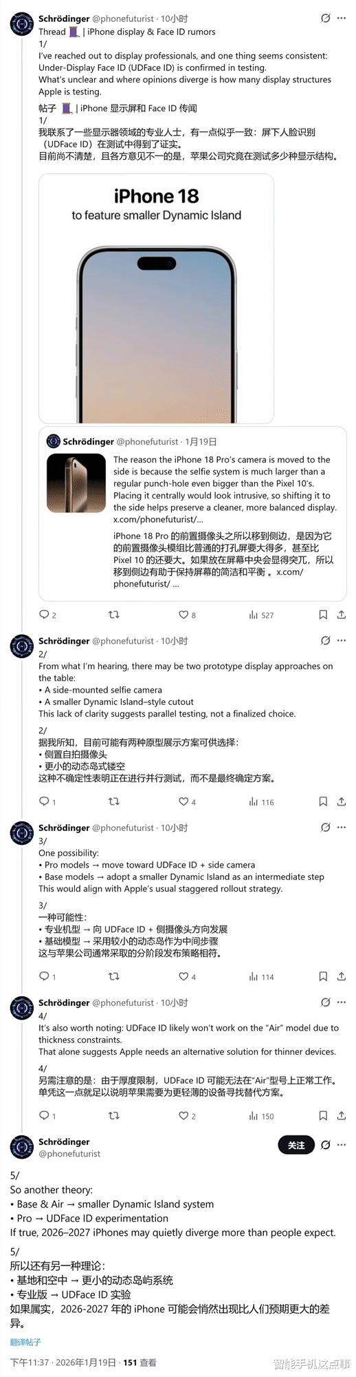 根据最新的供应链测试反馈,苹果确实在同步研发多种屏下方案,但 iPhone Air2已经基本确认无缘屏下Face ID,原因很简单,也很直接,那就是机身太薄了。