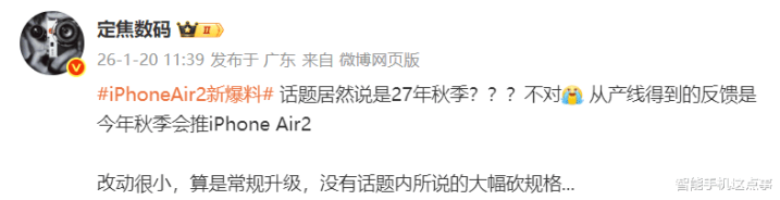 而且Air2选择在2026年登场,对其发展压力来说还是蛮大的,但博主透露改动很小,算是常规升级,没有大幅砍规格。
