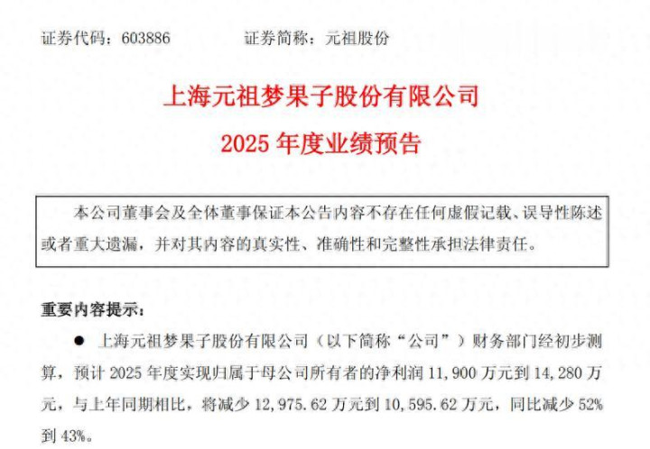 2026年1月16日,“烘焙第一股”上海元祖梦果子股份有限公司(以下简称“元祖股份”)发布了2025年度业绩预告,预计全年归属于母公司所有者的净利润约1.19亿元至约1.43亿元,同比大幅下滑52%-43%;扣除非经常性损益的净利润更是跌至约9500万元至约1.14亿元,同比降幅达59%-51%,盈利水平直接回退至2015年。