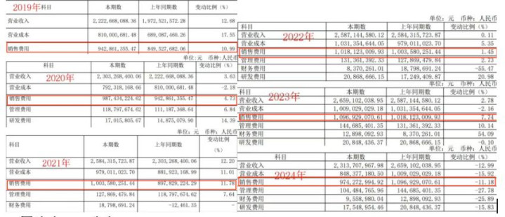 {jz:field.toptypename/}而造成盈利结构失衡的核心原因可能在于元祖股份居高不下的销售费用:2019年至2024年元祖股份的销售费用分别约为9.42亿元、9.87亿元、10.03亿元、10.18亿元、10.97亿元、9.74亿元,分别占营业收入比例约42.4%、42.9%、38.8%、39.4%、41.3%、42.1%。