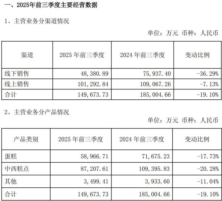 在此背景下,2025年前三季度,元祖股份三大核心产品全线溃败:蛋糕、中西糕点及其他产品营收分别同比下滑约17.73%、约20.28%和约11.04%,线上线下渠道同步收缩,线下销售收入同比下滑约36.29%,线上收入也下降约7.13%。