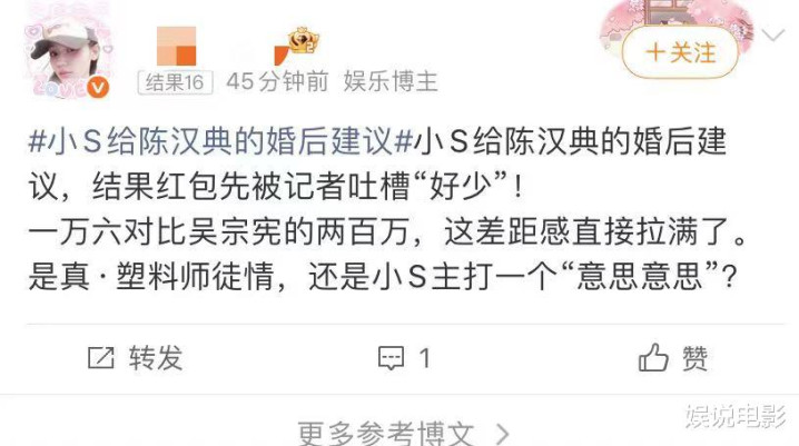 网友拿小S和吴宗宪的红包比较,记者吐槽小S的红包好少,吴宗宪送出200万台币,折合人民币约44万元,所以小S还是不如吴宗宪大方。陈汉典是吴宗宪的亲徒弟,而小S只是熟人一个吧?