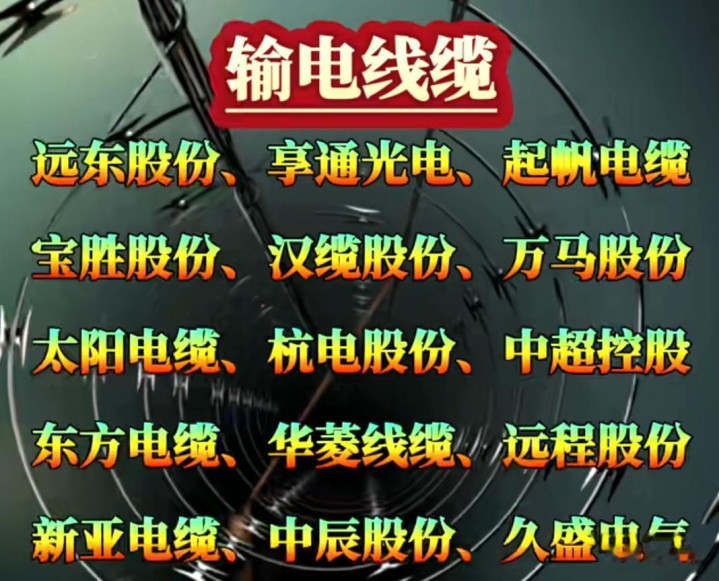 输电线缆用于电力的传输。远东股份、享通光电、起帆电缆、宝胜股份、汉缆股份、万马股份、太阳电缆、杭电股份、中超控股、东方电缆、华菱线缆、远程股份、新亚电缆、中辰股份、久盛电气等企业在输电线缆市场品类齐全,能够满足不同长度、不同电压等级的输电需求,在国家电网的大规模建设中,输电线缆的需求量巨大,这些企业将迎来产销两旺的局面。