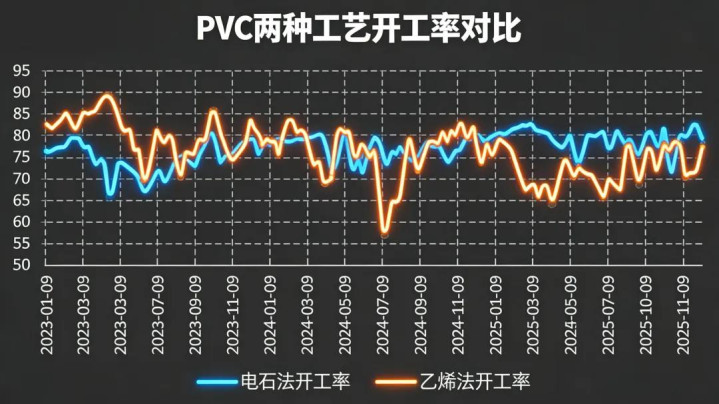 氯碱工业以电解食盐水为核心工艺,同时产出三种产品:烧碱(NaOH)、氯气(Cl₂)、氢气(H₂)在工业实践中,氯气的去向决定了氯碱装置的开停,而非烧碱自身的盈利水平。以PVC为例,国内70%以上的PVC采用电石法工艺,而电石法PVC的关键原料之一正是氯气。这使得PVC成为氯气最重要、也是最稳定的下游。由此形成一个高度捆绑的关系:PVC开工率≈氯气需求强度≈烧碱被动供应水平。这也是烧碱价格经常出现“基本面看似极弱、但企业却迟迟不减产”的根本原因。
